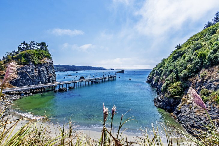 一个巨大的海堆被称为佩韦特岛将特立尼达州立海滩分成两个单独的海湾。南部海湾是主要通道,在灯塔路尽头的城镇西侧停车。该停车场也是徒步旅行者开始的地方特立尼达头循环步道。